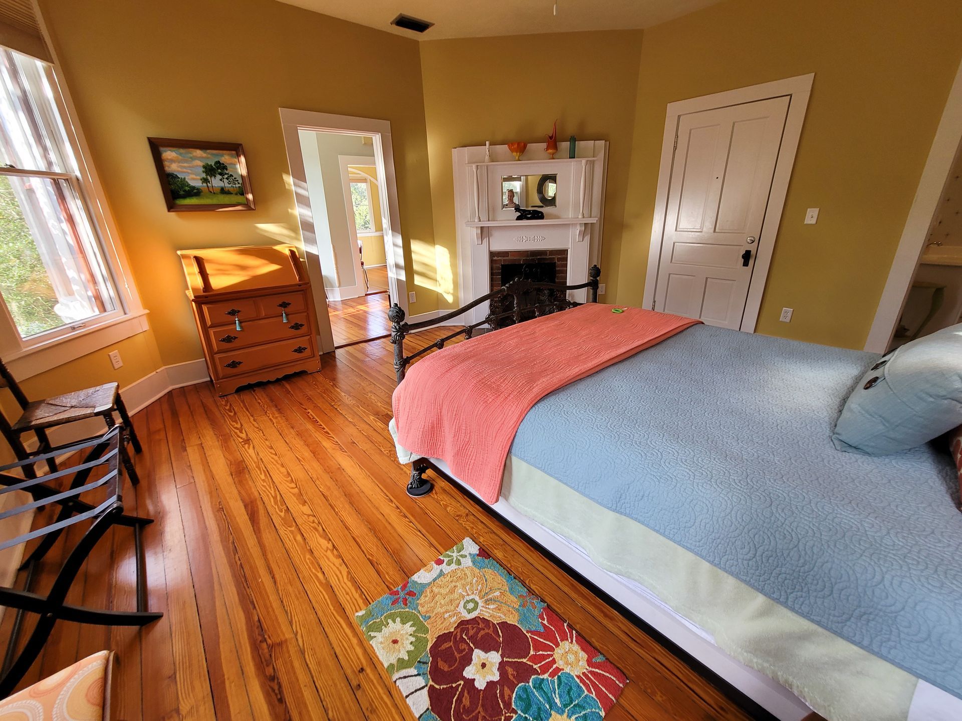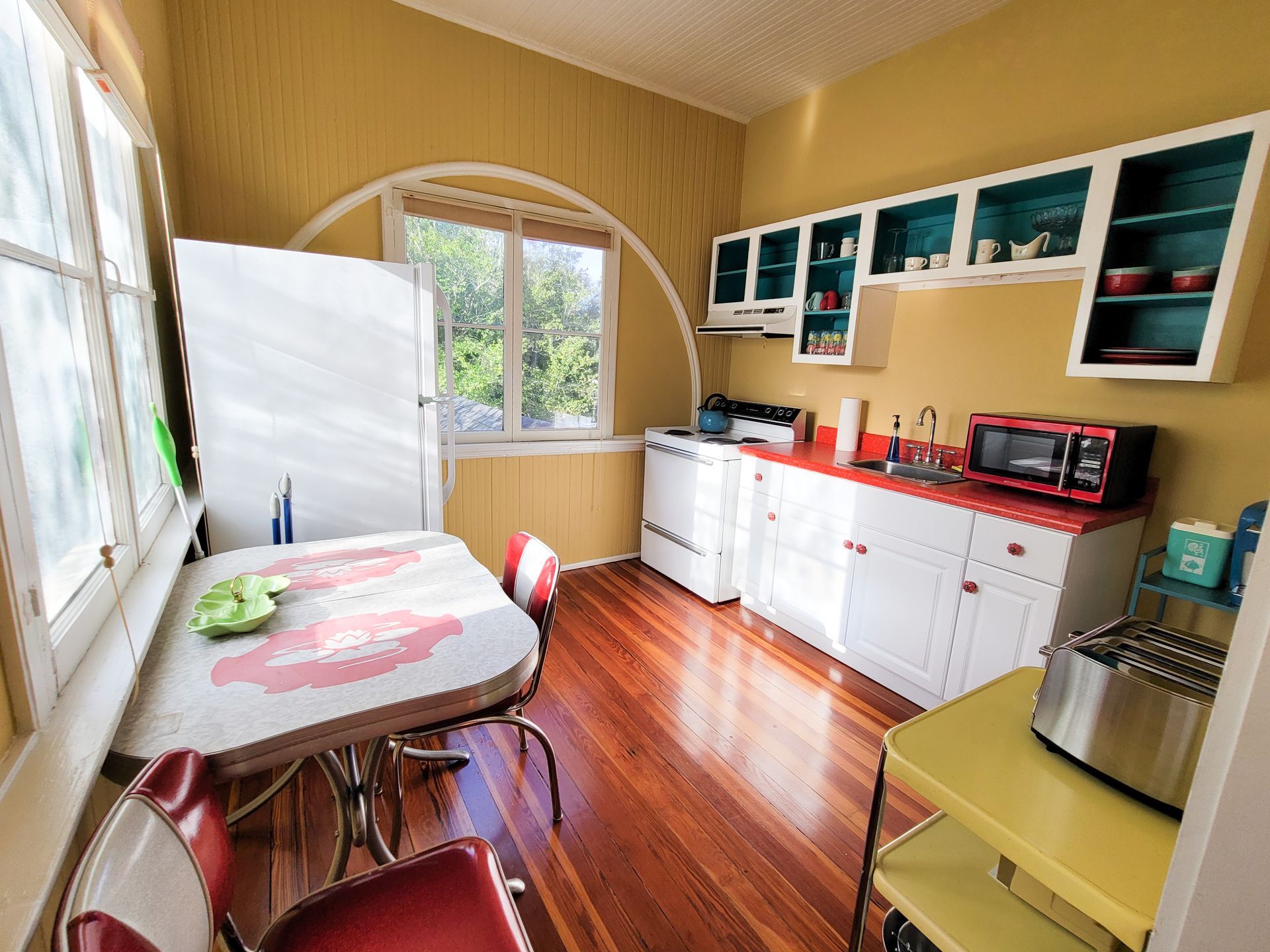The Hodges Turret is located on the 2nd Floor of the Historic Hodges house, located behind the Camellia Rose House. It is a 650 sq ft completely furnished apartment decorated in Mid Century Modern. If you’re looking for a unique, historic place in Gainesville to stay for a romantic weekend or for an extended stay vacation, this is the perfect room for you. Please note that the Hodges apartments do not come with breakfast at the Inn.